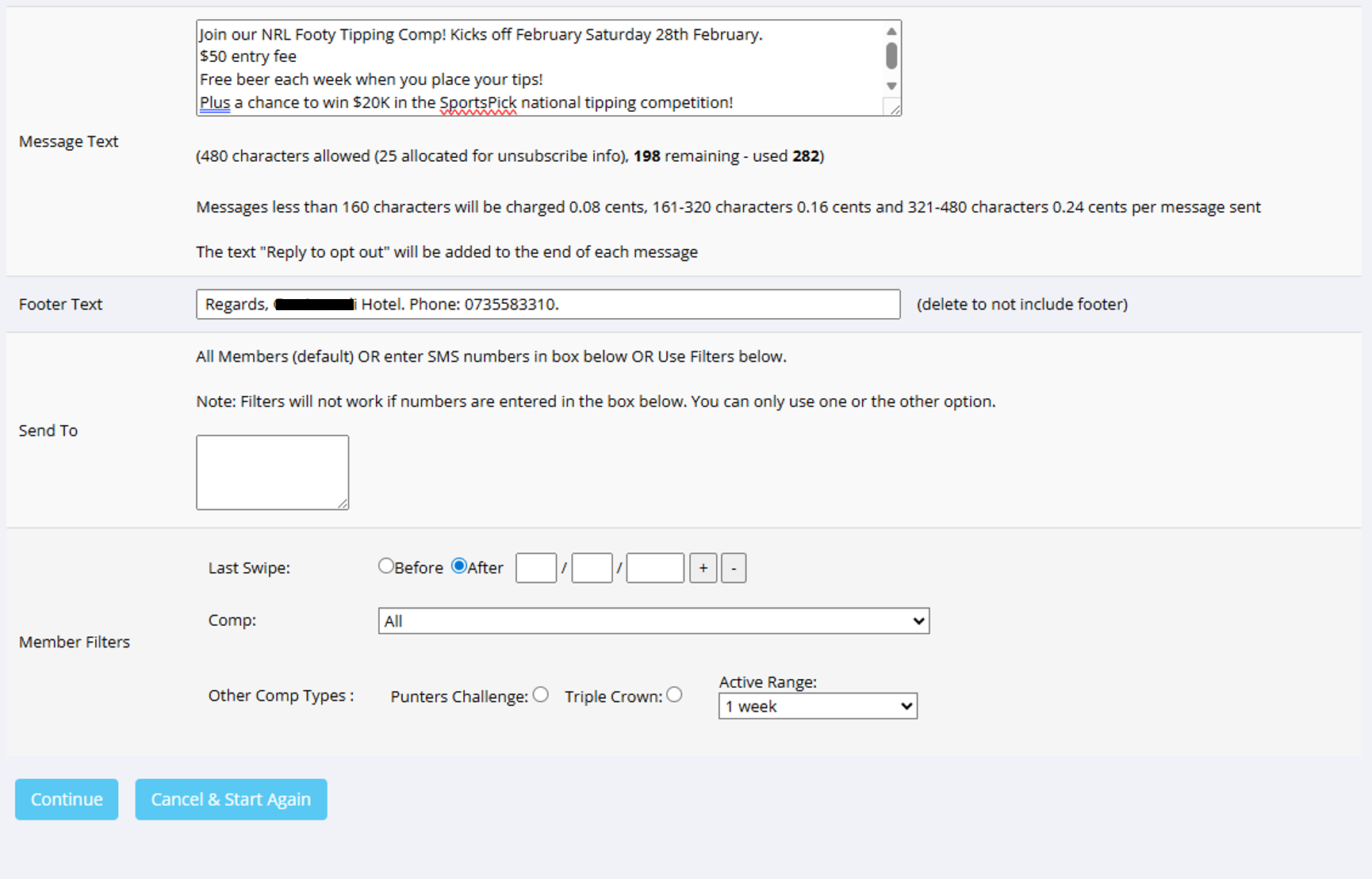 - Choose between entering specific SMSs (using the "Send To" box) or using the member filters (selecting from the filters to determine the segment of members you want to send an SMS to.