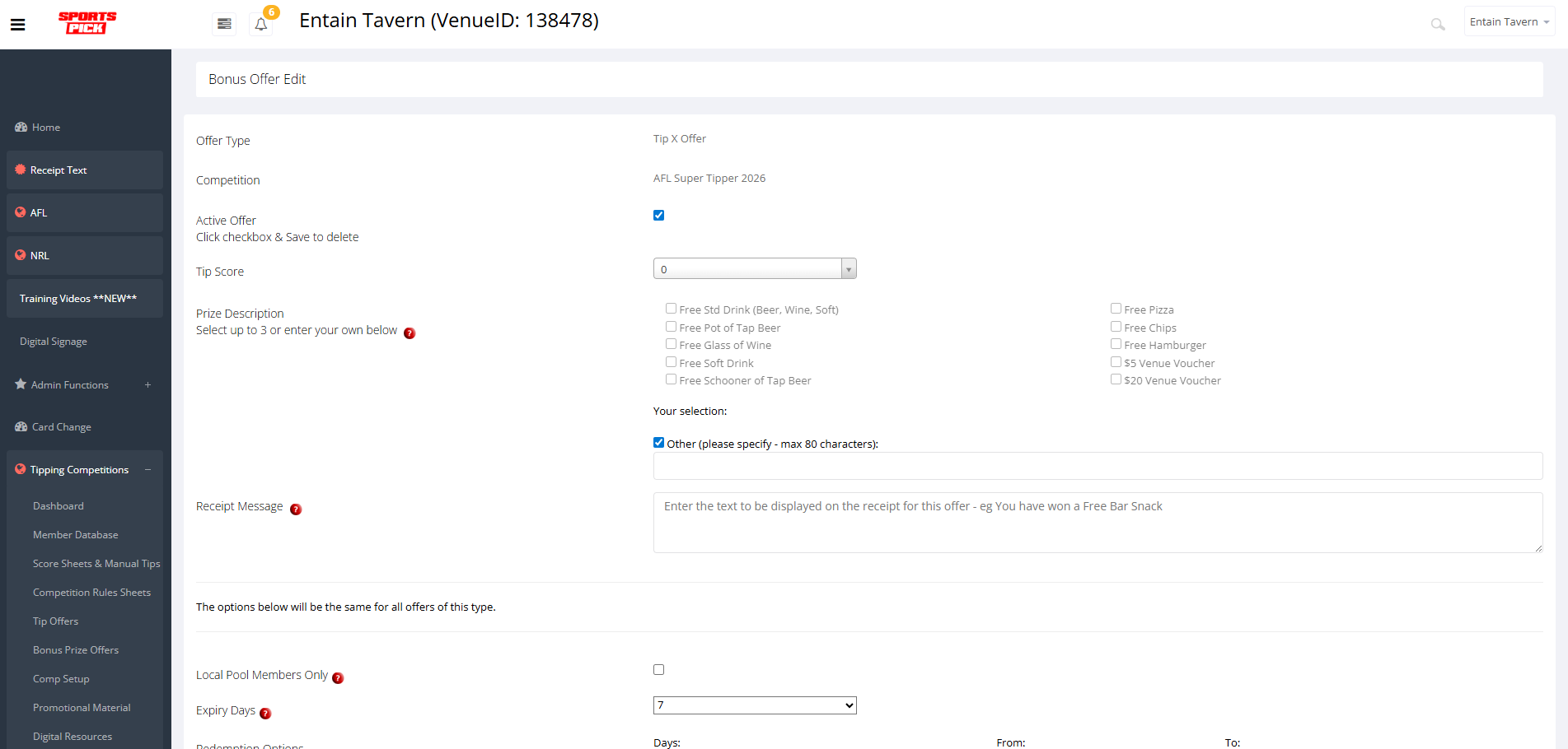 - Tip X Offer (Members receive a prize for tipping X or above each week; venue to set the value)
