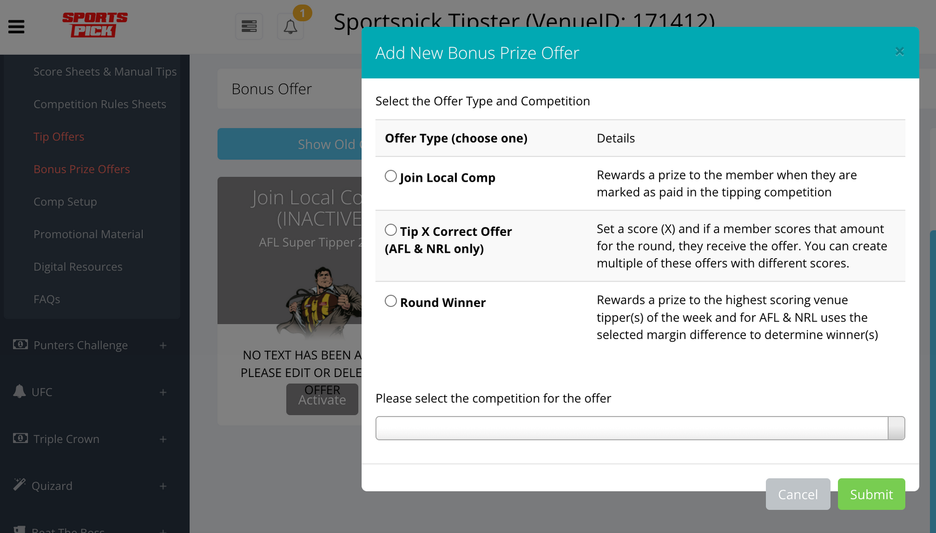 - When the "Add New Bonus Offer" screen pops up, choose the competition that you wish to attach the offer to e.g. NRL Super Tipper 2026. Make sure that the year is correct