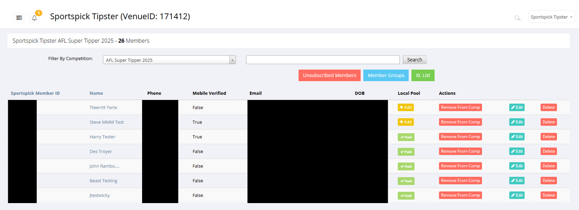 - Go down the list and Select “Add” to everyone who’s paid your local venue comp entry fee. All unpaid tippers will have an asterisk * next to their name which means they’re ineligible for local prizes, but eligible for National Prize Pools only.