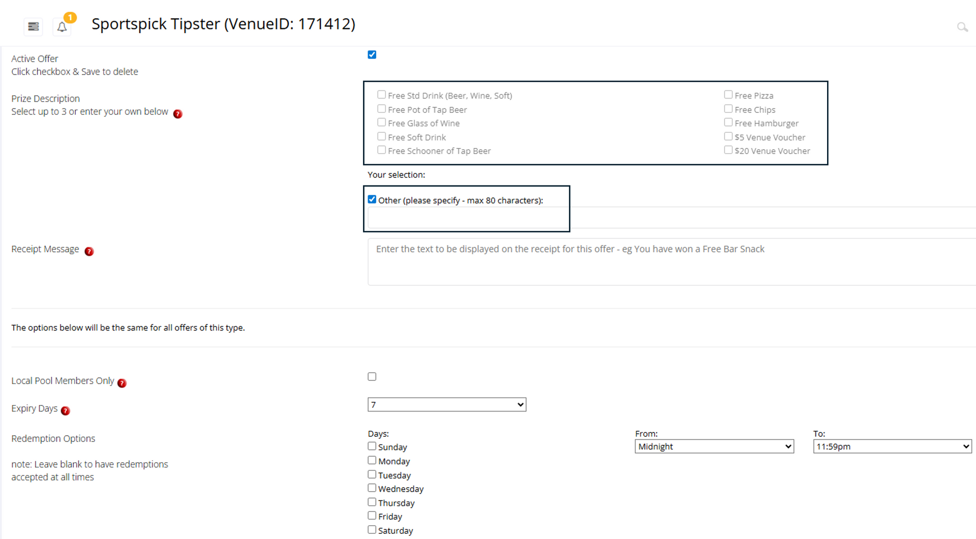 - In the section for "Expiry Days" and "Redemption Options", Set redemption day/time limits. Note that these will print on the receipts